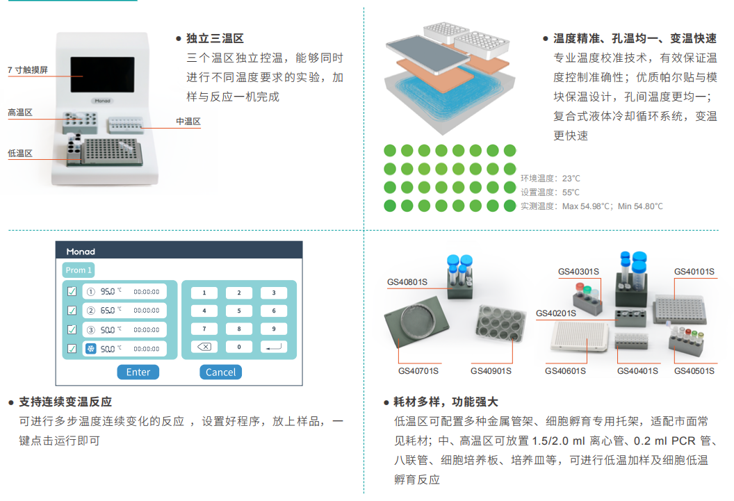 ● 中溫區(qū):可設(shè)置溫度范圍為 8~99.9℃,用于試劑樣品的解凍、酶切實驗、熱激反應(yīng)及逆轉(zhuǎn)錄類連續(xù)變溫反應(yīng)等 。